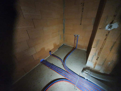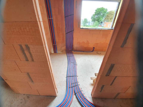 Voor de sanitaire voorzieningen hebben we aparte buizen aangelegd voor twee badkamers, een apart toilet, de keuken en buitenkranen. Deze installatie zorgt voor een betrouwbare watertoevoer en voldoet aan de behoeften van de klant.